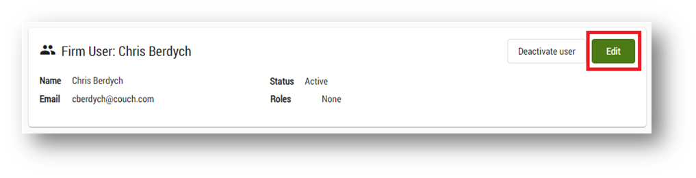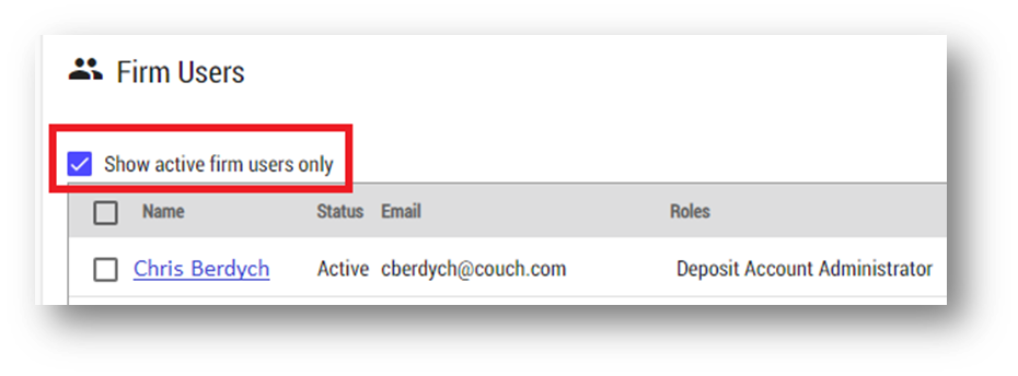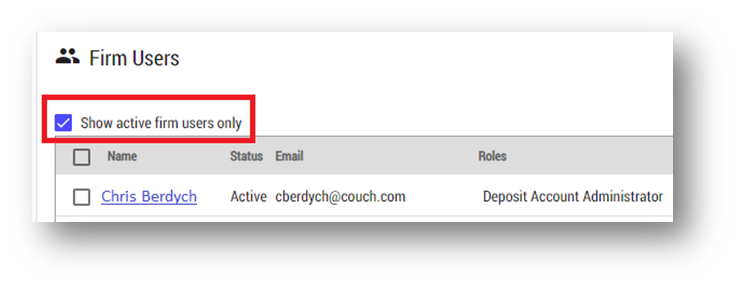 - Click to remove the 'show active firm users only' filter to view all active and inactive users, including those you just deactivated: