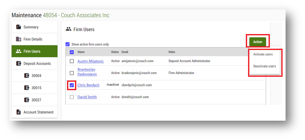 - Select the users you want to deactivate by checking off their name on the firm user list.