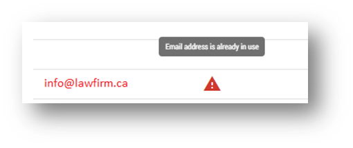 - All firm users must have a unique email address to help ensure a secure login process. Any email addresses which aren’t unique will be highlighted in red and display a warning on the firm user list: