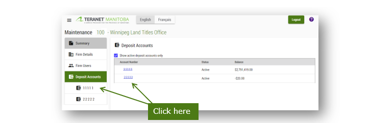 You can add or remove user access to the land titles deposit account from the maintenance application menu. Account administrators (or backup account administrators) can grant/revoke user access to a land titles deposit account under the deposit accounts tab.
