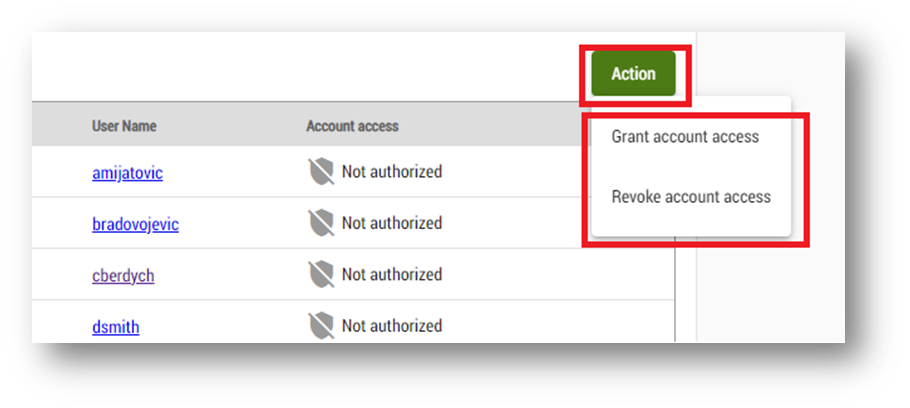 - Click 'action' in the top right corner and choose to either grant or revoke access.