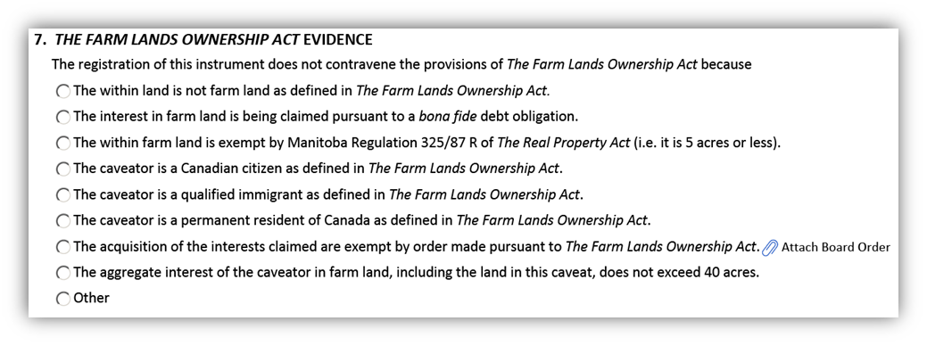 - The Farm Lands Ownership Act evidence statements available will vary depending on the information provided in boxes 2 and 3.