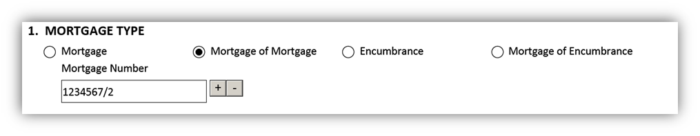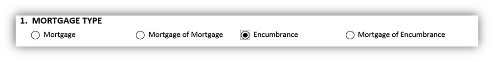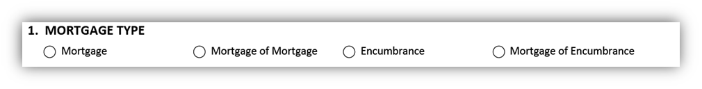 Use this box to indicate the type of mortgage to be field. There are four options to choose from: