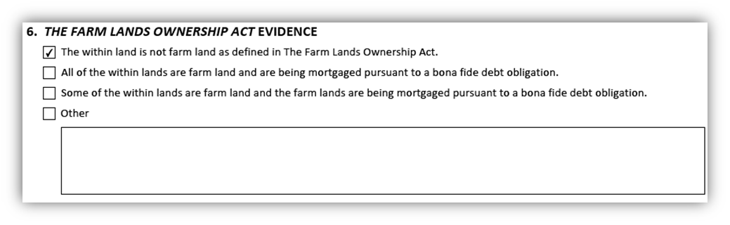 There are three prepared options that you may choose from when providing The Farm Lands Ownership Act evidence in this box. If none of these options are applicable you may provide an appropriate statement in the box attached to the other option located at the end of the list.