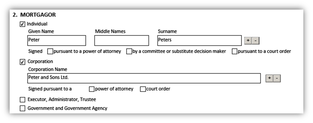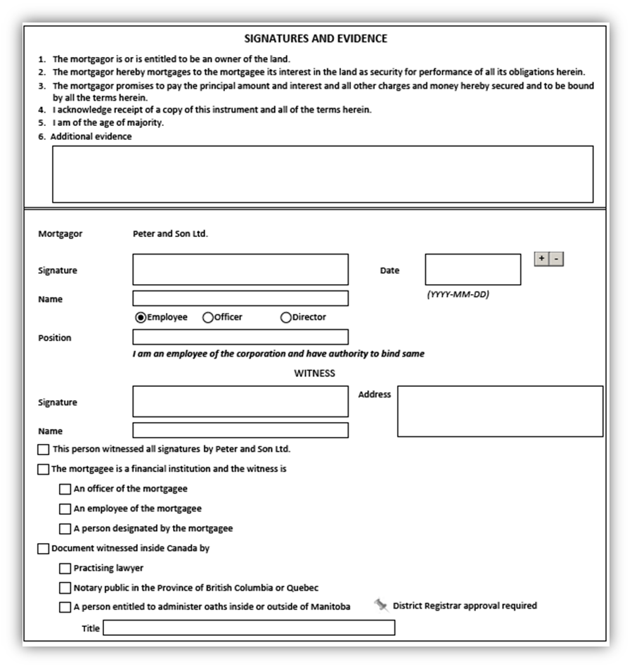 - For example, if the mortgagors/grantors of encumbrance are an individual, two corporations and an executor, four separate signature pages will be created: one for the individual, one for each corporation and one for the executor.