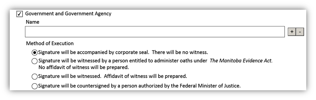 - If Government and Government Agency is selected, the box will expand to show a field in which to add one or more government transferors. It will also allow you to specify the method of execution that will be used.