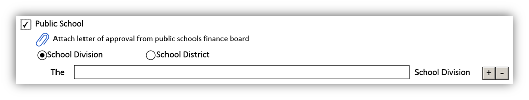- If Public School is selected, the box will expand to show a field in which to add one or more public school transferors. It will prompt you to include the necessary approval letter.