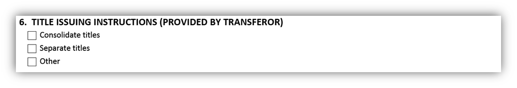 Title issuing instructions are requests that are made to land titles regarding the title, such as consolidating or separating the titles. Boxes 6 and 14 are entirely optional . In most scenarios, you will not need to providing title issuing instructions at all.