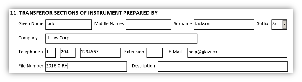 | Name: | These fields (given name, middle names surname and suffix) can be used to provide an individual contact name for the party preparing the instrument. |