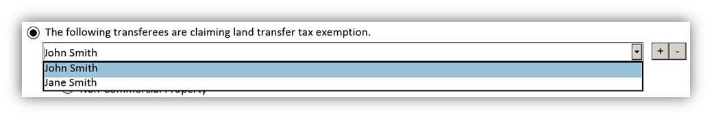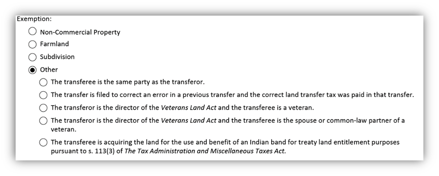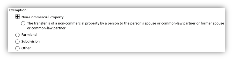 Once the transferee claiming the exemption has been identified, you will select the nature of the exemption from the list provided. For each exemption type several additional fields will need to be completed. The list of available exemptions is based on the nature of the transferors and the transferees in the Transfer. For example, a corporation cannot claim a transfer of non-commercial property exemption from their spouse or common-law partner.