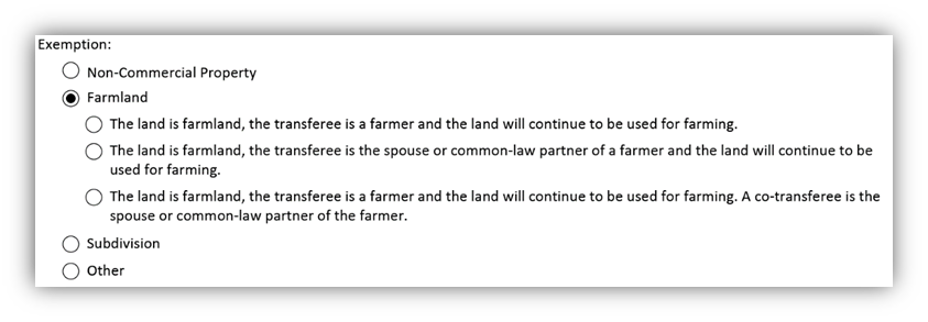 The default option is no land transfer tax exemption. If this is the case then no further information is required.