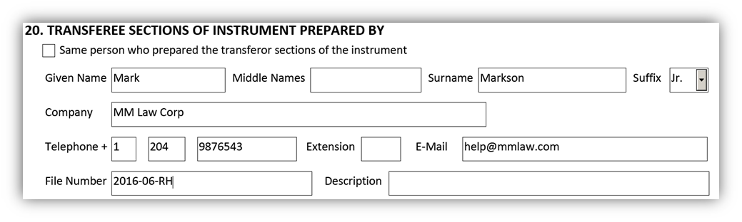 There are several fields available in this box. If the same person has prepared both the transferor and the transferee sections of the transfer then this can be indicted by selecting the checkbox. The information in box 20 will auto-fill to duplicate box 11.