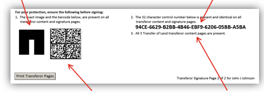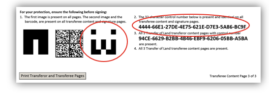 Once the transferor section is locked, four security features will be embedded onto each page. The security features are unique to each individually created document and offer a level of protection and encryption of the information.