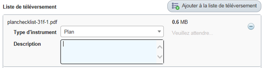 - Téléversez la Liste de contrôle de plans remplie. Dans le champ de description, entrez « Liste de contrôle de plans pour le dépôt numéro XX/XXXX ».