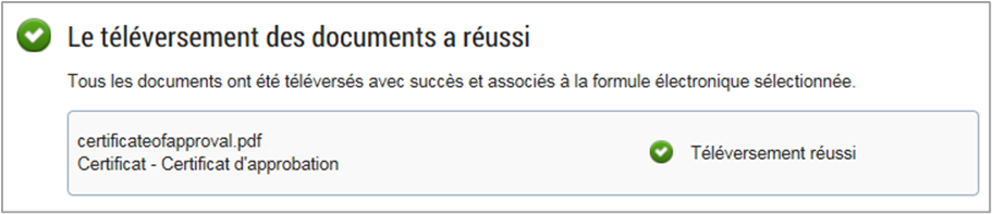 - Si un certificat d’approbation est requis avec l’envoi de votre série de plans, ajoutez un PDF du certificat d’approbation. Sélectionnez Certificat - Certificat d’approbation pour le type de document.