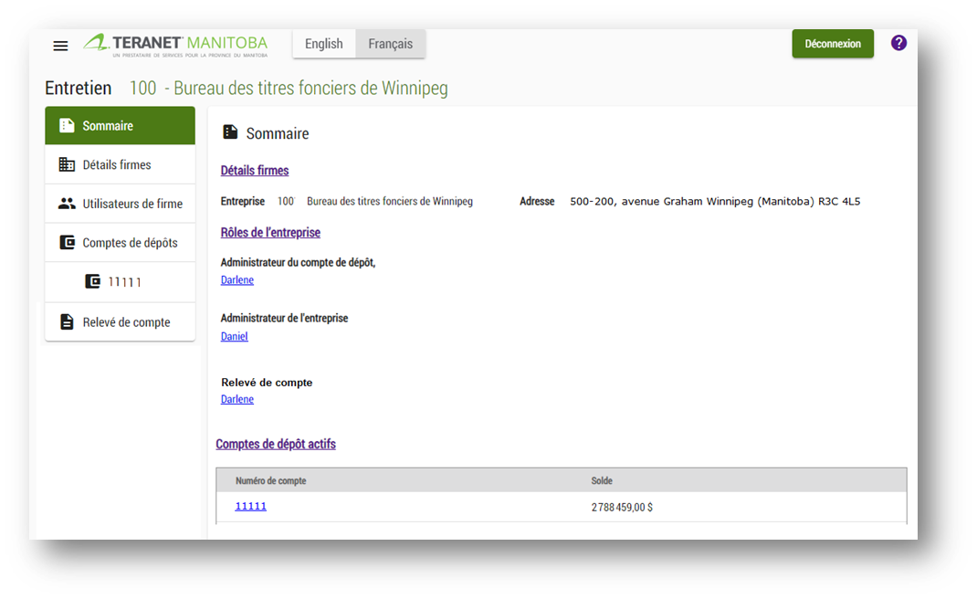 Vous pourrez voir les renseignements concernant votre firme, y compris le nom, l’adresse, les rôles au sein de la firme (administrateurs des comptes, administrateurs de la firme et administrateurs des relevés de compte) ainsi qu’une liste des comptes. Consultez le sommaire de l’administration de la firme pour savoir comment apporter des modifications concernant votre firme, vos comptes ou vos utilisateurs.