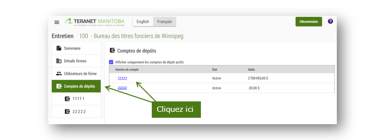 Si vous avez plusieurs comptes, c’est le premier qui apparaîtra par défaut. Cliquez sur le lien vers le compte que vous voulez gérer dans la section de la page consacrée aux comptes de dépôt. Chaque compte de dépôt est géré séparément.