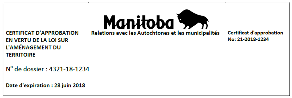 Le certificat d’approbation original doit être envoyé à titre de document à l’appui du plan (la liste de contrôle de plan) pour les plans de lotissement à l’extérieur de la ville de Winnipeg. N’enregistrez pas le certificat d’approbation séparément.