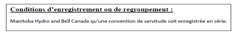 Les documents requis pourraient comprendre des ententes de servitudes de services publics, de regroupement ou d’aménagement. Dans l’exemple ci-dessous, des servitudes de services publics sont requises. Ces ententes de servitude doivent être enregistrées en série avec le plan.