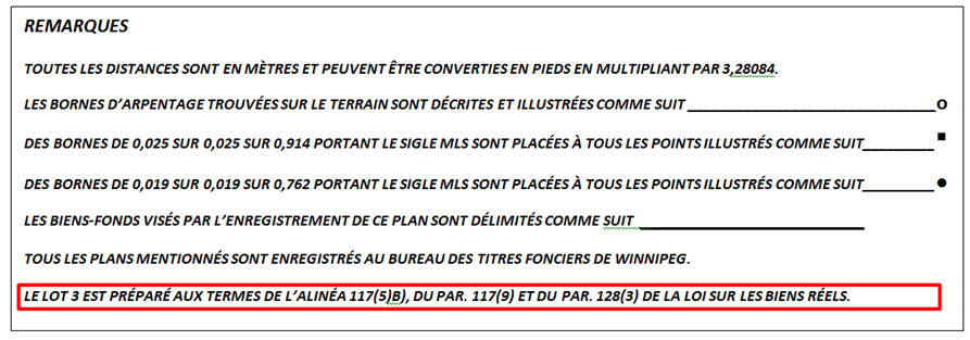 Exemple de la section des remarques d’un plan où un lot a été inclus en vertu de l’article 117 de la Loi sur les biens réels :