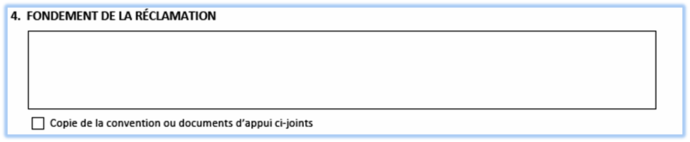 Cette case permet à l’opposant de préciser les circonstances qui sont à l’origine de l’intérêt foncier faisant l’objet d’une réclamation. On peut mentionner ici des conventions ou d’autres documents qui ont donné naissance à l’intérêt foncier. Si une convention ou un document d’appui de ce type doit être annexé, sélectionner le champ indiquant qu’une convention ou un document est joint.