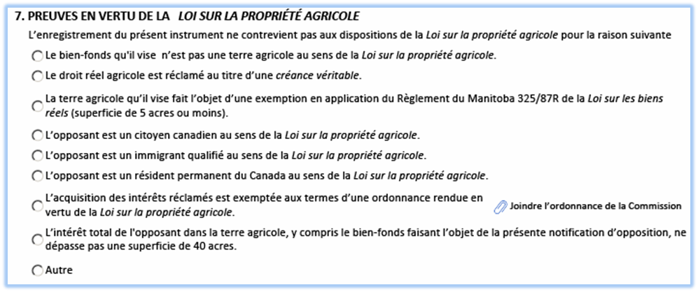 - Si aucune preuve n’est exigée, la case contiendra la déclaration Des preuves en vertu de la Loi sur la propriété agricole ne sont pas exigées.