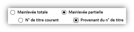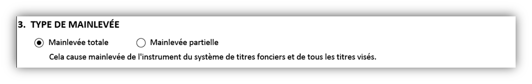 - Si une partie seulement des biens-fonds d’un titre fait l’objet de la mainlevée, on choisit l’option une partie.