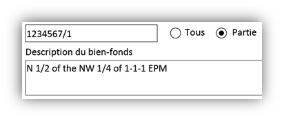 - Aucune description de bien-fonds ne sera requise avec cette option. Le mot TOUS apparaîtra automatiquement dans le champ Description des biens-fonds.