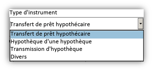 - Le type d’instrument de cession doit être choisi dans le Menu déroulant.