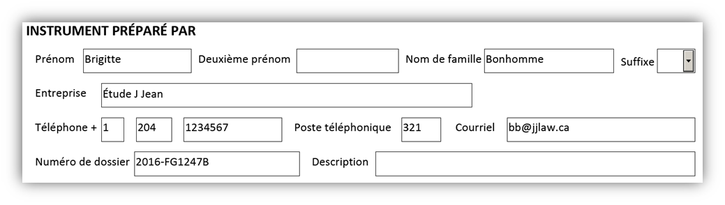 | Nom : | On peut utiliser ces champs (prénom, deuxième nom et nom de famille, suffixe) pour indiquer la partie préparation de l'instrument pour fournir leurs informations de contact. |