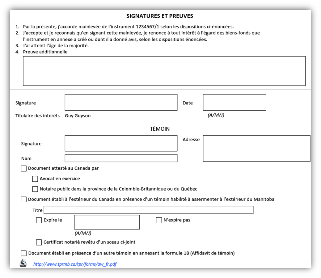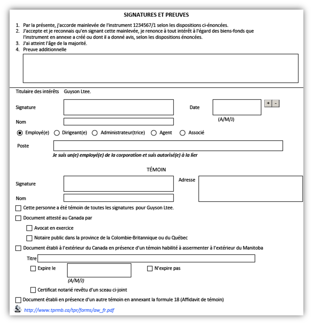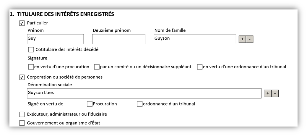 - Les renseignements requis dans les pages de signature varient selon le ou les titulaires des intérêts enregistrés indiqués dans la case 1.