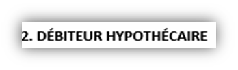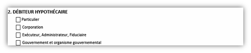 Selon la sélection faite pour la case 1, la case 2 prendra le nom de Débiteur hypothécaire ou de Débiteur de charge.