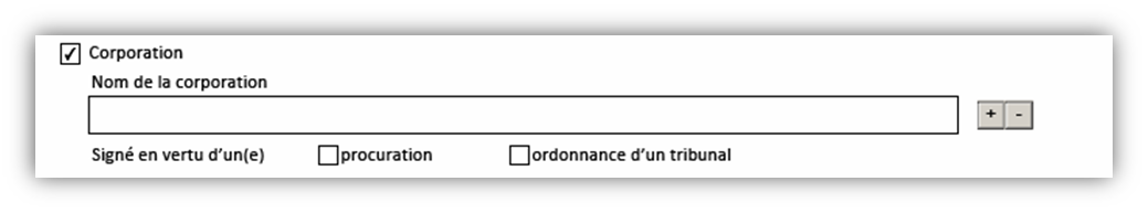• Si vous sélectionnez une corporation, la case s’agrandit pour afficher un champ où vous pouvez ajouter une ou plusieurs corporations débitrices hypothécaires et leurs adresses aux fins de signification.