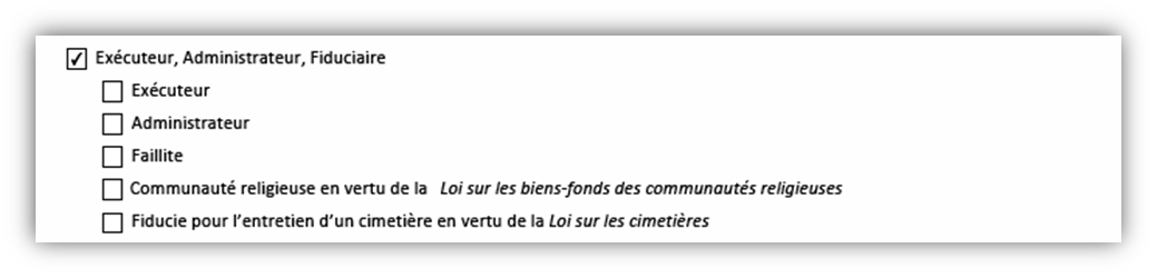 • Les options permettent au débiteur hypothécaire de préciser s’il est l’exécuteur ou l’administrateur d’un domaine, un syndic de faillite ou un fiduciaire d’une communauté religieuse ou d’une fiducie pour l’entretien d’un cimetière.