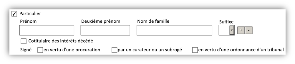 - Il y a plusieurs autres champs facultatifs qui peuvent être sélectionnées, au besoin. Les options comprennent l’indication d’un détenteur d’intérêts conjoint décédé et de la signature du document en vertu d’une procuration ou d’une ordonnance du tribunal, ou par un curateur ou subrogé.