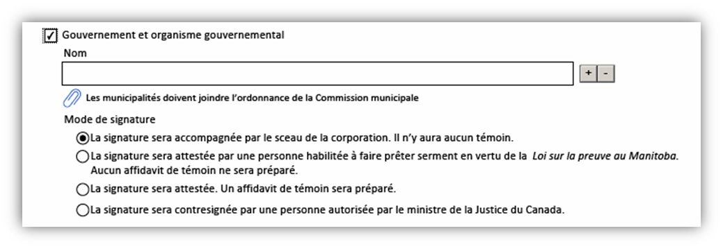 - En plus d’indiquer le nom du gouvernement ou de l’organisme gouvernemental, vous devez sélectionner le mode de signature.