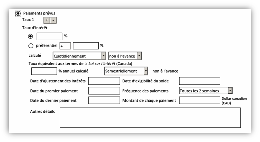 - Vous pouvez indiquer plusieurs conditions de taux et conditions générales en sélectionnant l’icône pour ajouter des champs sous l’option des paiements prévus.
