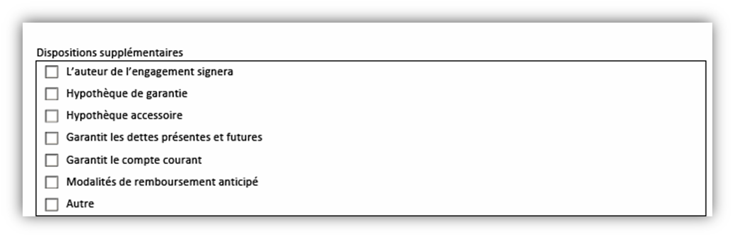 - Finalement, la sélection de certaines options permet d’ouvrir des champs en blanc où vous pouvez entrer des détails qui ne sont pas inclus dans les champs déjà disponibles, y compris des détails sur une hypothèque de garantie ou une hypothèque accessoire, l’indication que l’hypothèque garantit les dettes présentes et futures ou non, ou qu’elle garantit le compte courant ou non, les modalités de remboursement anticipé et toute autre condition.