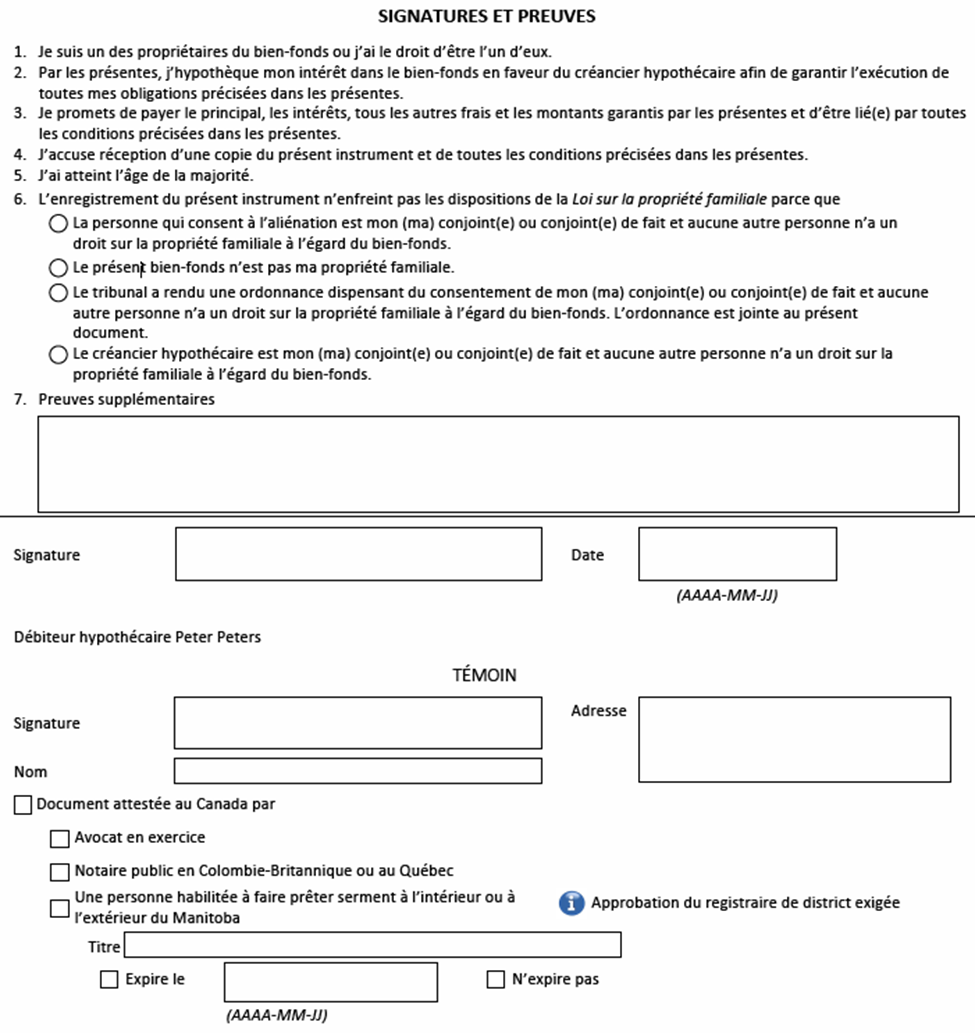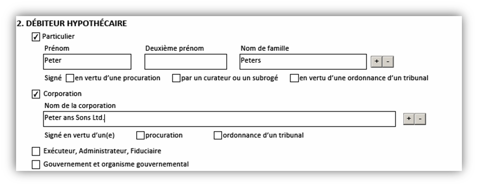 • Une page de signature est créée pour chacun des débiteurs hypothécaires ou débiteurs de charge indiqués dans la case 2.