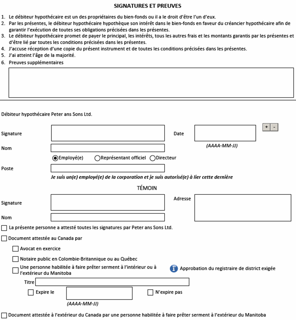 - Par exemple, si les débiteurs hypothécaires ou débiteurs de charge sont un particulier, deux corporations et un exécuteur, quatre pages de signature distinctes sont créées, soit une pour le particulier, une pour chaque corporation et une pour l’exécuteur.
