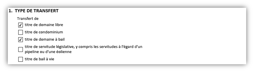 Utilisez cette case pour indiquer le type de bien-fonds que vise le transfert. Il est possible de faire plusieurs choix. La partie suivante donne un aperçu de chacune des options.