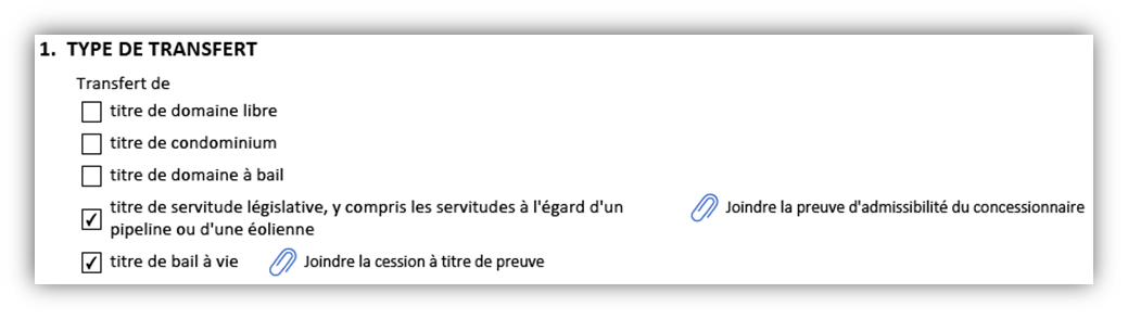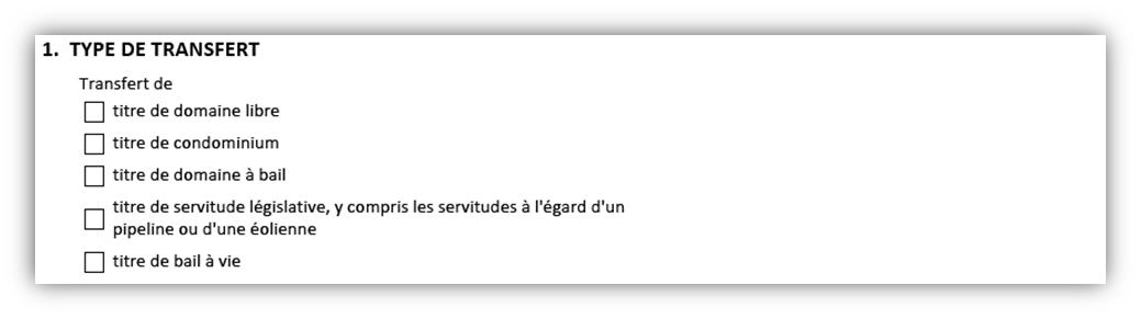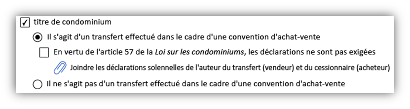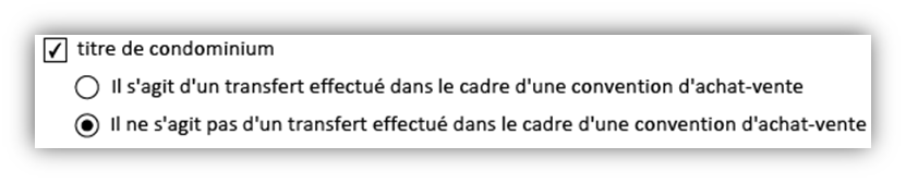 Si vous choisissez l'option titre de condominium, vous devrez indiquer si le transfert est effectué dans le cadre d'une convention d'achat-vente ou pas. Selon l'option que vous choisissez, d'autres renseignements pourraient être exigés.