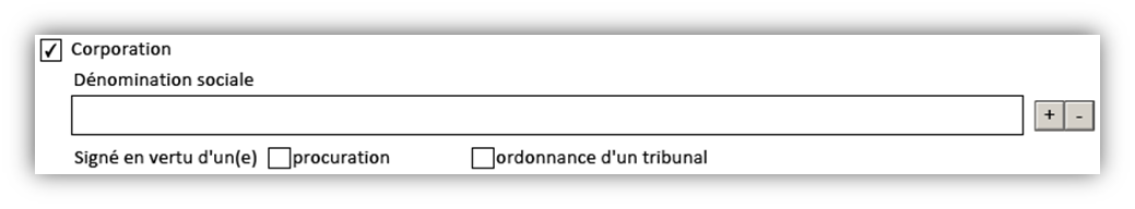 - Si l'on choisit Corporation, la case s'agrandit afin de faire apparaître un champ dans lequel on peut ajouter un ou plusieurs auteurs du transfert (corporations).