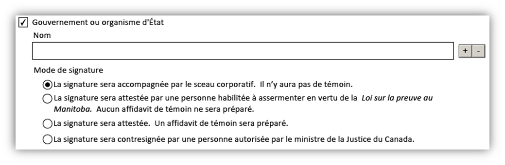 - Si l'on choisit Gouvernement ou organisme d'État, la case s'agrandit afin de faire apparaître un champ dans lequel on peut ajouter un ou plusieurs auteurs du transfert (gouvernements ou organismes d'État). On peut aussi préciser le mode de signature qui sera utilisé.