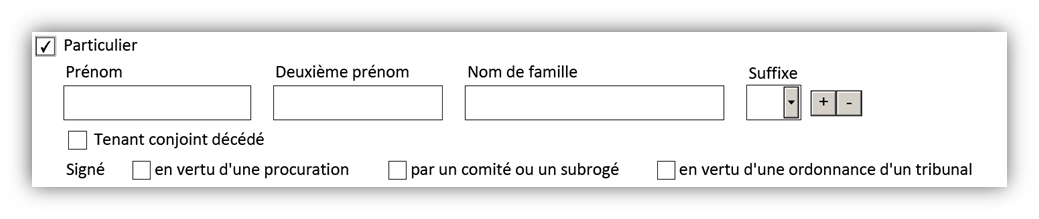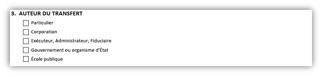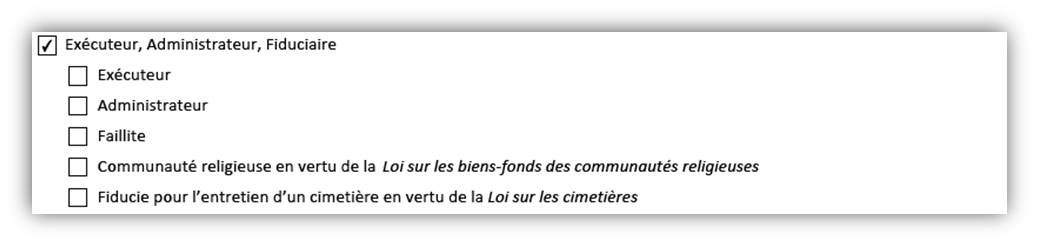 - Ces options vous permettront de préciser si l'auteur du transfert est l'exécuteur ou l'administrateur d'une succession, les fiduciaire de la faillite, ou les fiduciaires d'une communauté religieuse ou d'une fiducie pour l'entretien d'un cimetière.