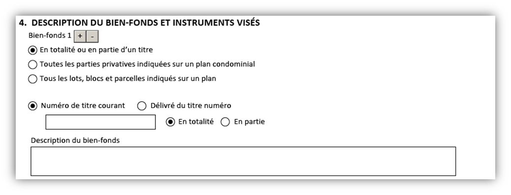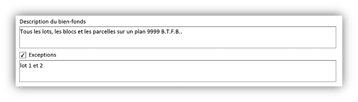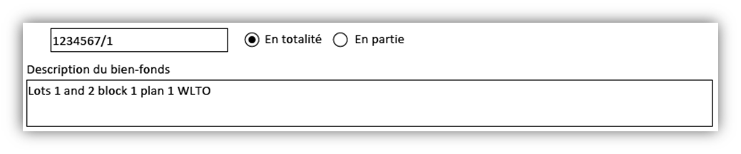 - Le champ de description du bien-fonds sera reproduit automatiquement selon la façon dont ces champs sont remplis