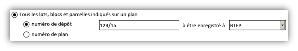 - Sélectionner Tous les lots, blocs et parcelles indiqués sur un plan si le transfert sera enregistré à l'égard de tous les lots, blocs et parcelles indiqués sur un plan.