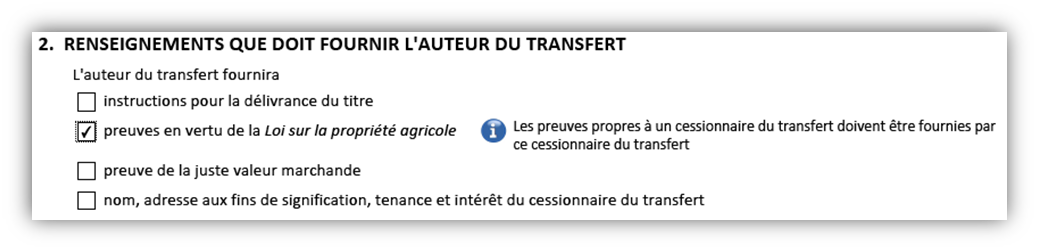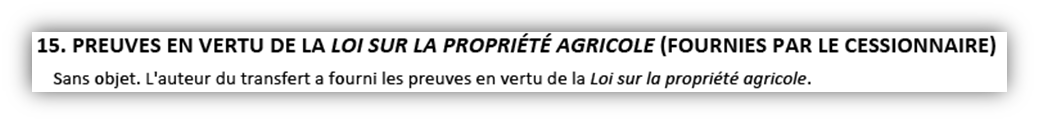 Si le cessionnaire du transfert fournit les preuves en vertu de la Loi sur la propriété agricole, les cases 7 et 15 se présenteront comme suit :