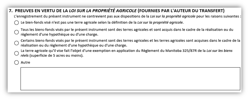 Lorsque l'auteur du transfert fournit les preuves en vertu de la Loi sur la propriété agricole et qu'aucune des options proposées dans la liste ne convient, vous pouvez faire une déclaration personnalisée dans la case qui suit l'option autre à la fin de la liste.