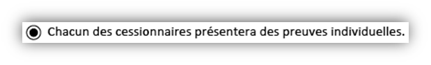 Dans ce scénario, il faudra faire une autre sélection. Vous devrez préciser qui fournira les preuves, les cessionnaires du transfert eux-mêmes ou un avocat et agent :